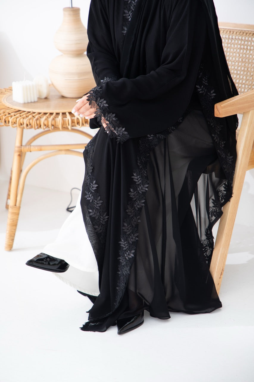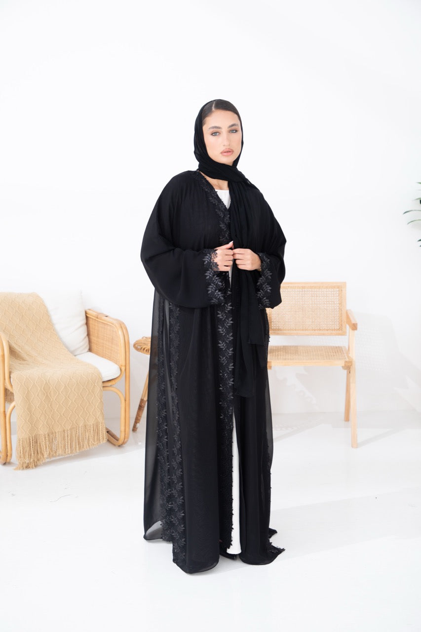 Raneem is a daily wear abaya that can also be used for ceremonies and parties. It is inspired by romantic harmonies and softness itself.